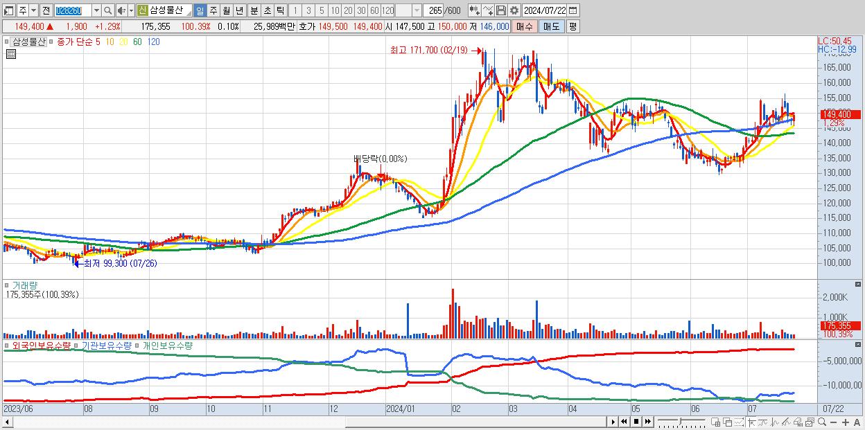- 삼성물산 (149,400원 ▲ 1.29% , 시총: 265,609억, 외국인 순매수 거래금:43억)