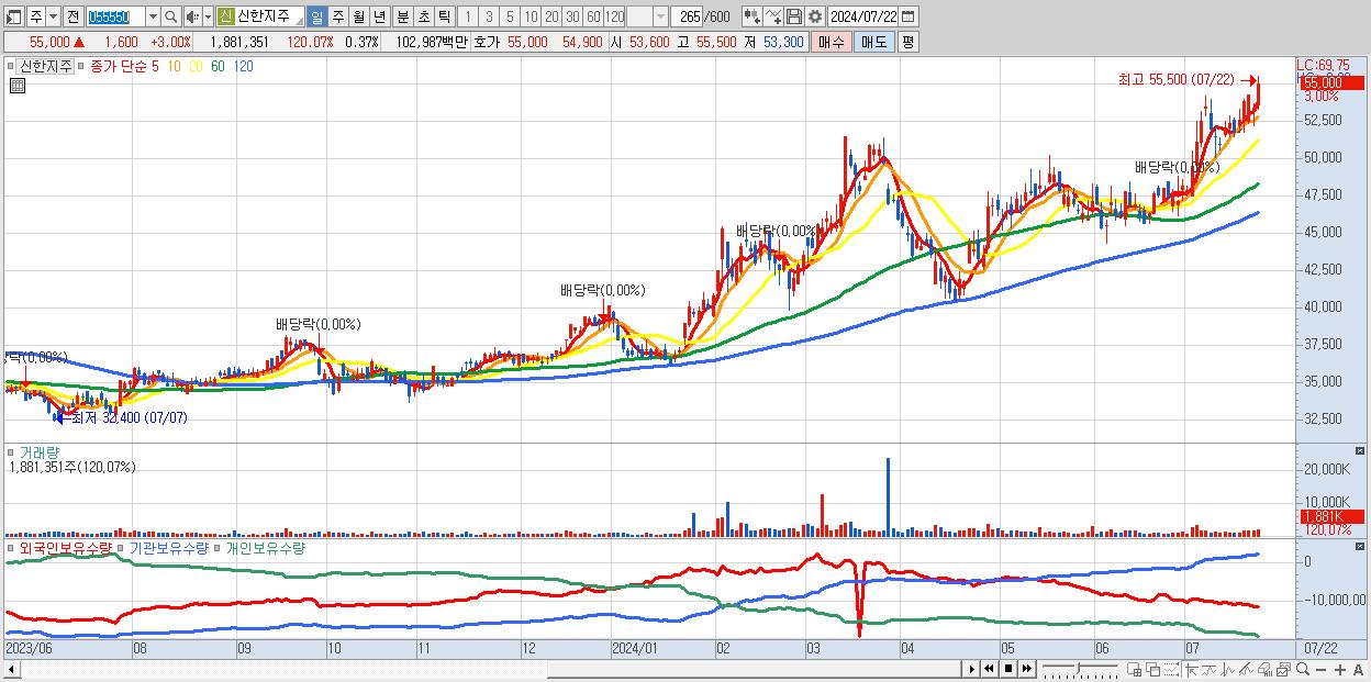 2.신한지주 55,000원 ▲ 3% (KOSPI, 055550)