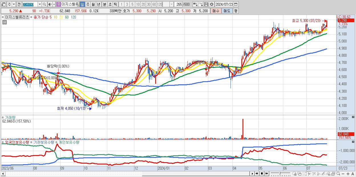 - 이지스밸류리츠 (5,290원 ▲ 1.73% , 시총: 2,721억, 거래량: 62,848, 거래대금:3억, KOSPI)