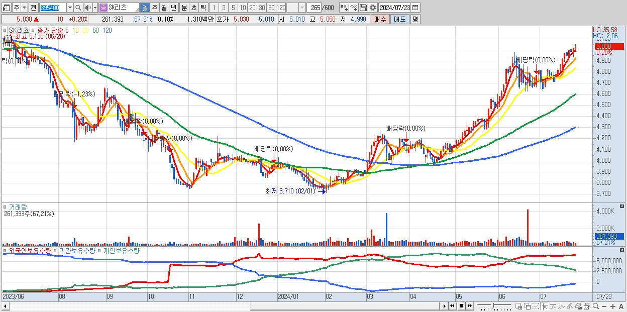 - SK리츠 (5,030원 ▲ 0.2% , 시총: 13,588억, 거래량: 261,393, 거래대금:13억, KOSPI)