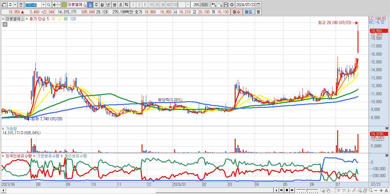 대봉엘에스 18,950원 ▲ 22.34% (KOSDAQ, 078140)