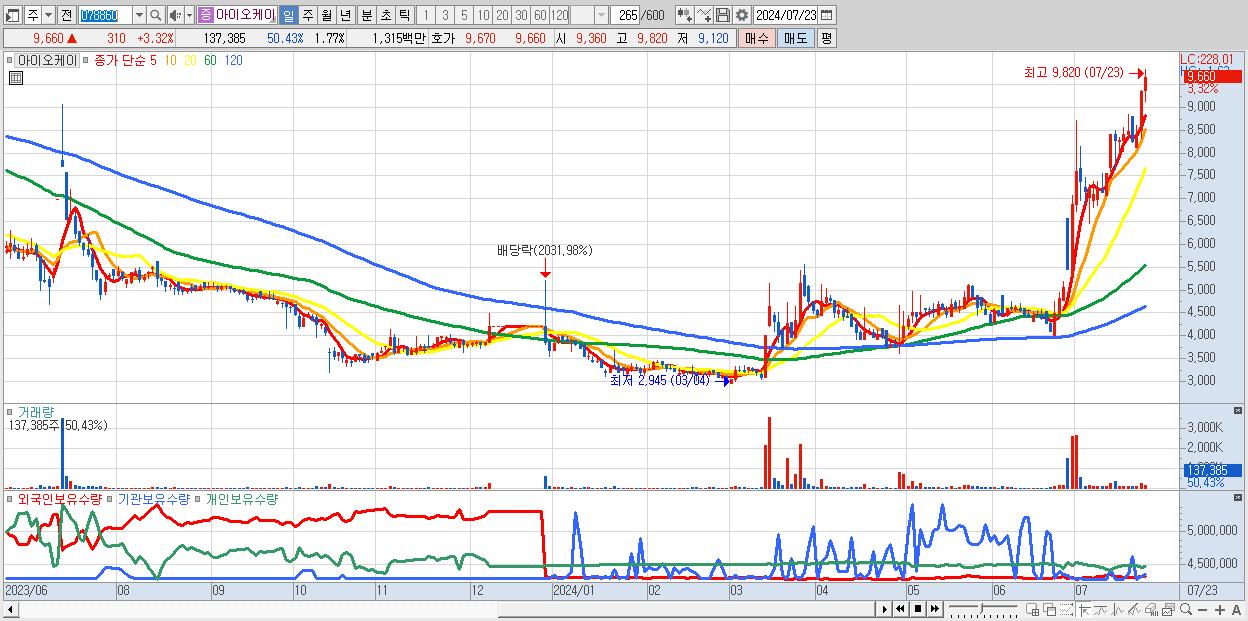 - 아이오케이 (9,660원 ▲ 3.32% , 시총: 748억, 거래량: 137,385, 거래대금:13억, KOSDAQ)