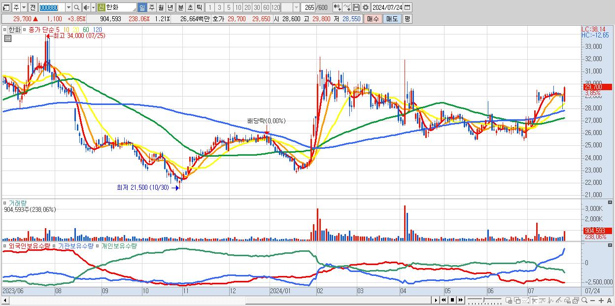 - 한화 (29,700원 ▲ 3.85% , 시총: 22,263억, 외국인 순매수 거래금:49억)