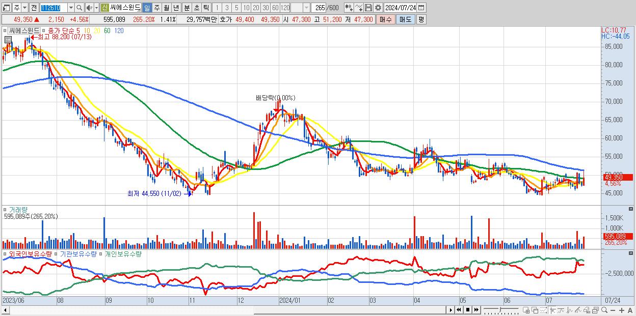 - 씨에스윈드 (49,350원 ▲ 4.56% , 시총: 20,812억, 외국인 순매수 거래금:50억)