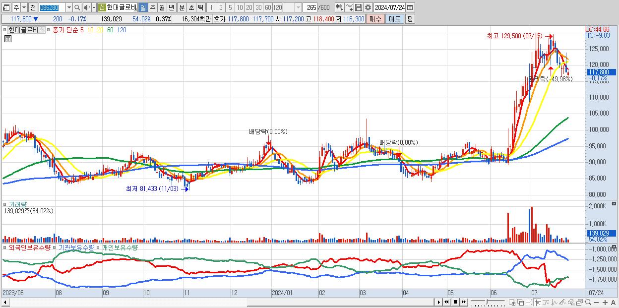 - 현대글로비스 (117,800원 ▼ -0.17% , 시총: 44,175억, 외국인 순매수 거래금:56억)