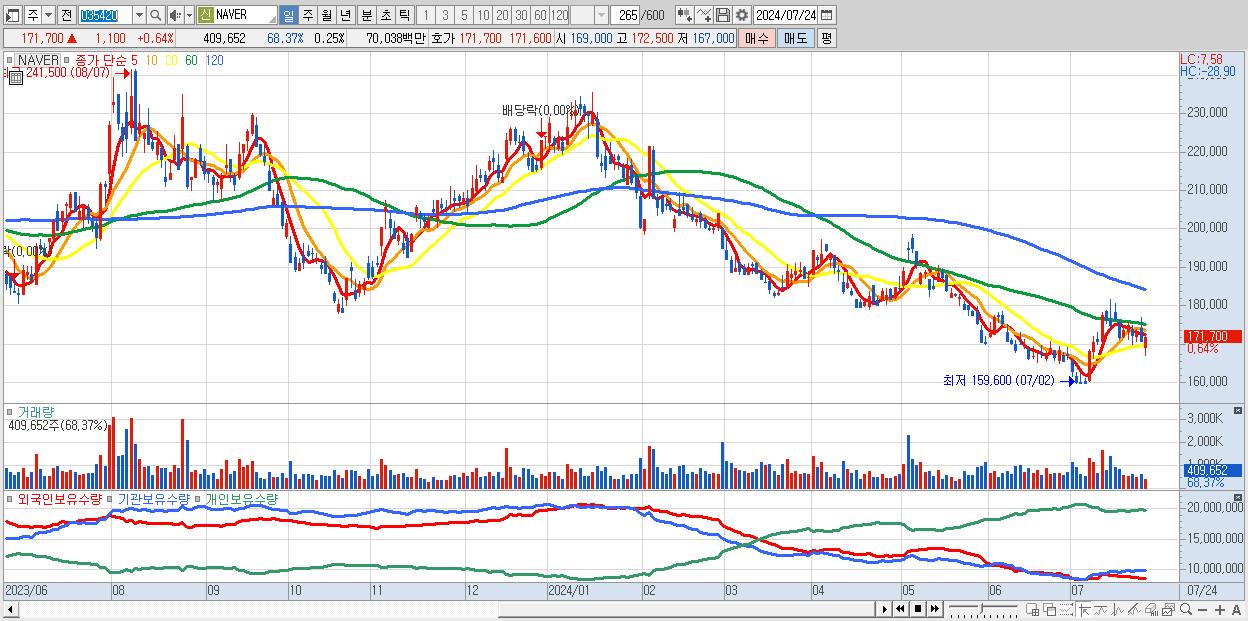 - NAVER (171,700원 ▲ 0.64% , 시총: 278,856억, 외국인 순매수 거래금:102억)