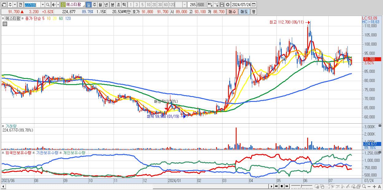 - 에스티팜 (91,700원 ▲ 3.62% , 시총: 17,848억, 외국인 순매수 거래금:41억)