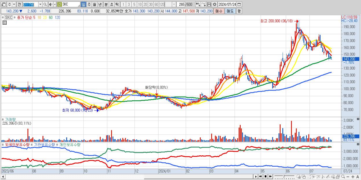 - SKC (143,200원 ▼ -1.78% , 시총: 54,227억, 외국인 순매수 거래금:56억)