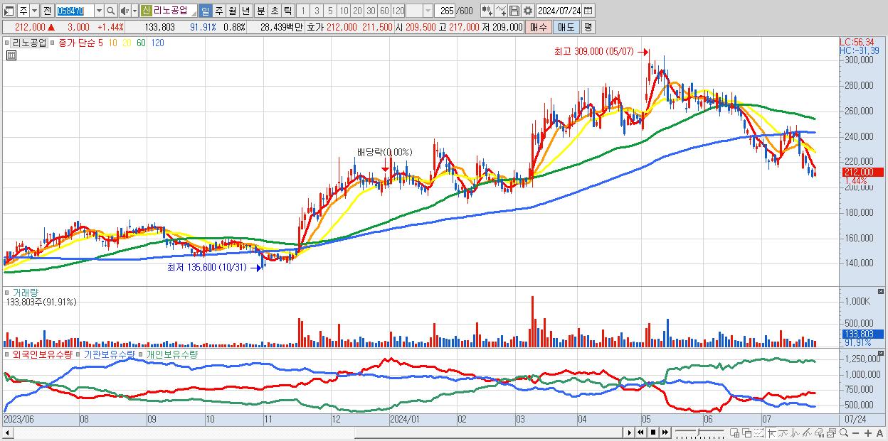 - 리노공업 (212,000원 ▲ 1.44% , 시총: 32,314억, 외국인 순매수 거래금:58억)