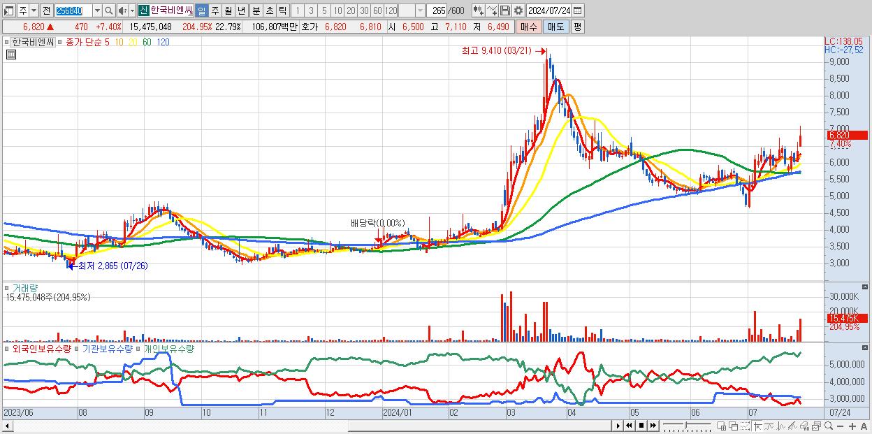 - 한국비엔씨 (6,820원 ▲ 7.4% , 시총: 4,632억, 거래량: 15,475,048, 거래대금:1,068억)