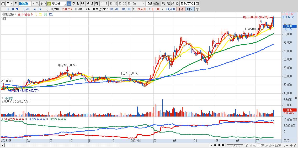 - KB금융 (84,600원 ▼ -4.19% , 시총: 341,370억, 거래량: 2,808,718, 거래대금:2,424억)