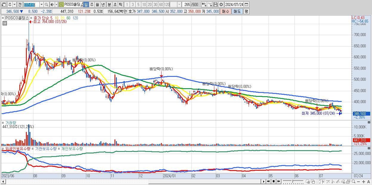 - POSCO홀딩스 (346,500원 ▼ -2.39% , 시총: 293,039억, 거래량: 447,310, 거래대금:1,566억)