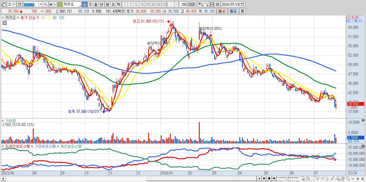 - 카카오 (39,550원 ▲ 1.8% , 시총: 175,382억, 거래량: 2,560,151, 거래대금:1,014억)