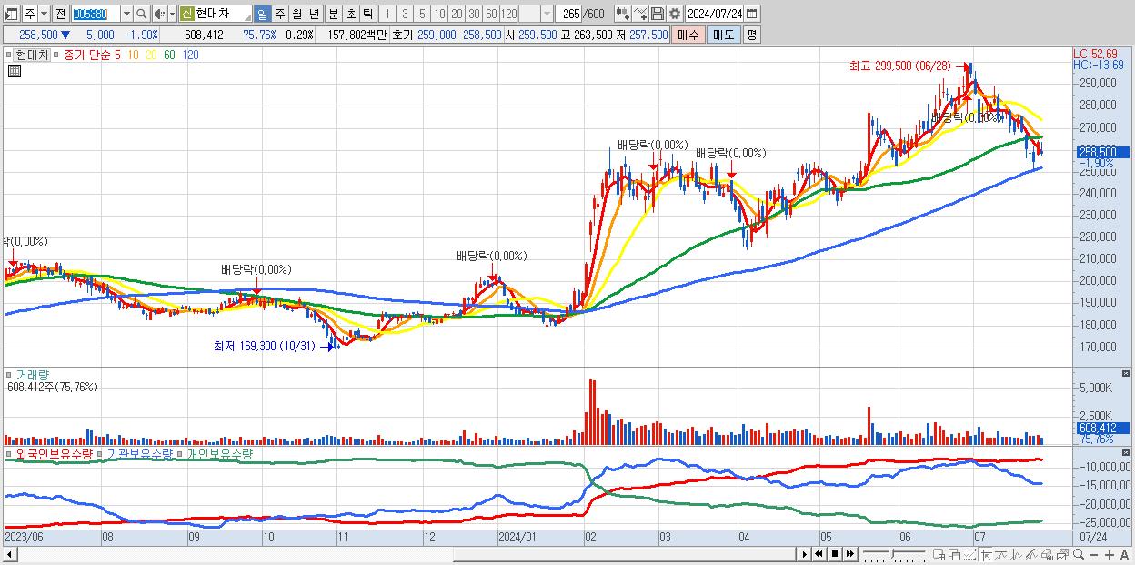 - 현대차 (258,500원 ▼ -1.9% , 시총: 541,341억, 거래량: 608,412, 거래대금:1,578억)