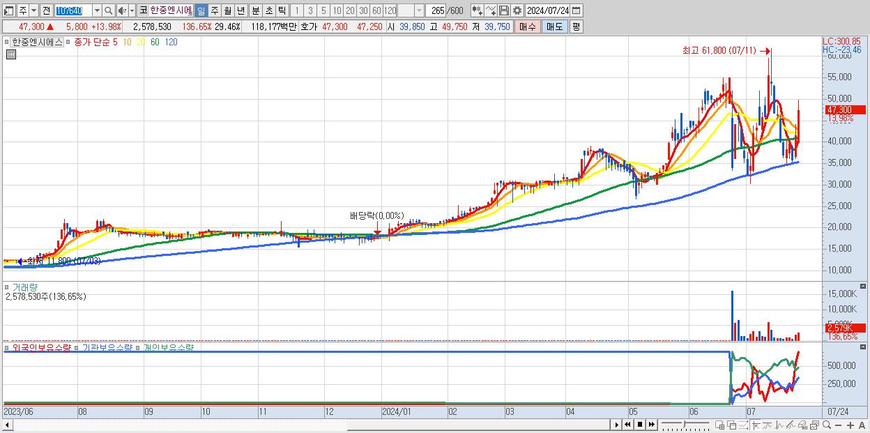 - 한중엔시에스 (47,300원 ▲ 13.98% , 시총: 4,139억, 거래량: 2,578,530, 거래대금:1,182억)