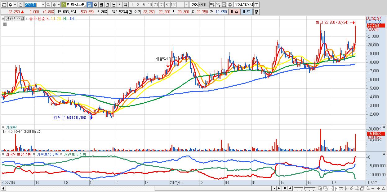 - 한화시스템 (22,250원 ▲ 9.88% , 시총: 42,035억, 거래량: 15,603,694, 거래대금:3,425억)
