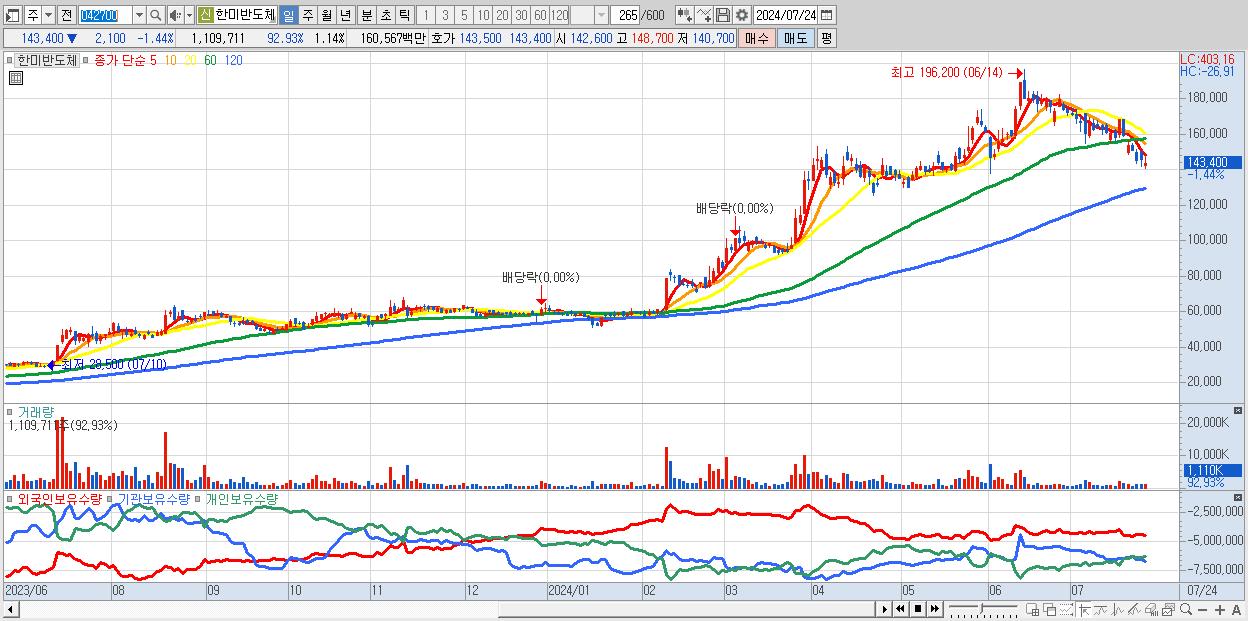 - 한미반도체 (143,400원 ▼ -1.44% , 시총: 139,089억, 거래량: 1,109,711, 거래대금:1,606억)