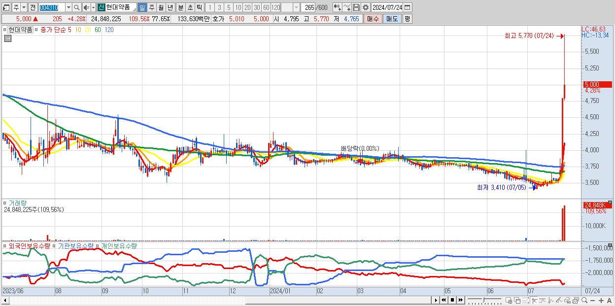 - 현대약품 (5,000원 ▲ 4.28% , 시총: 1,600억, 거래량: 24,848,225, 거래대금:1,336억)