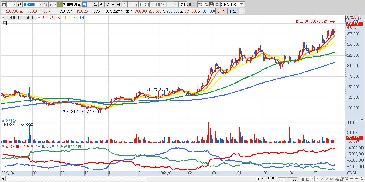 - 한화에어로스페이스 (298,500원 ▲ 4.01% , 시총: 151,131억, 거래량: 959,357, 거래대금:2,872억)