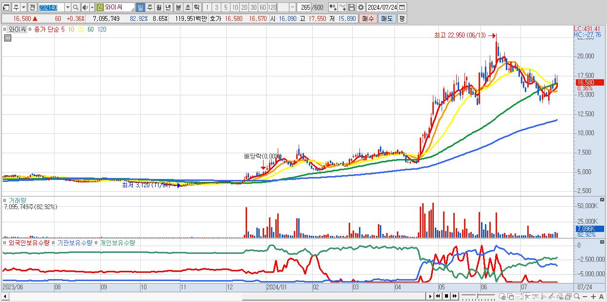 - 와이씨 (16,580원 ▲ 0.36% , 시총: 13,603억, 거래량: 7,095,749, 거래대금:1,200억)