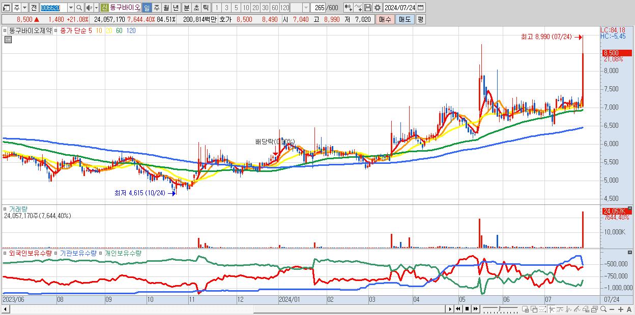 - 동구바이오제약 (8,500원 ▲ 21.08% , 시총: 2,420억, 거래량: 24,057,170, 거래대금:2,008억)