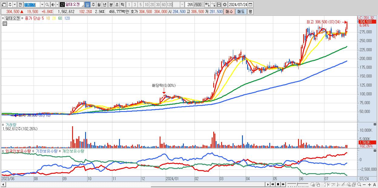 - 알테오젠 (304,500원 ▲ 6.84% , 시총: 161,837억, 거래량: 1,562,612, 거래대금:4,668억)
