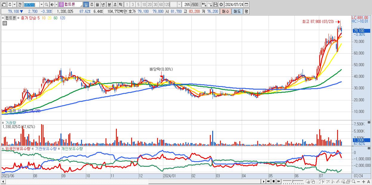 - 펩트론 (79,100원 ▼ -3.3% , 시총: 16,340억, 거래량: 1,330,025, 거래대금:1,048억)