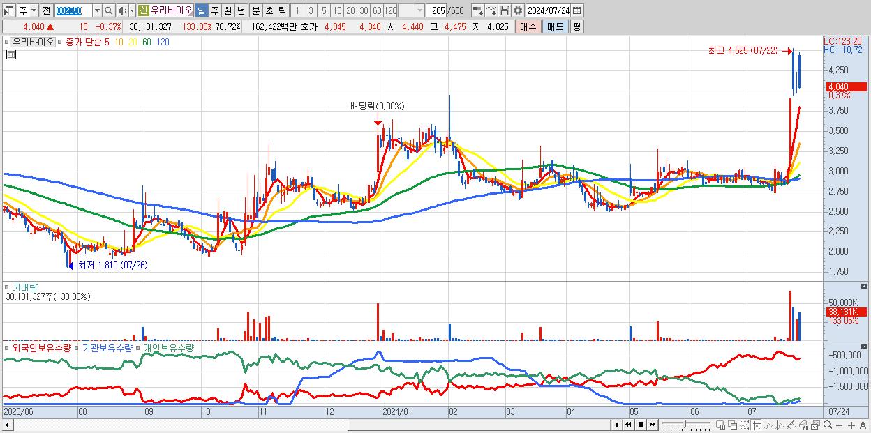 - 우리바이오 (4,040원 ▲ 0.37% , 시총: 1,957억, 거래량: 38,131,327, 거래대금:1,624억)