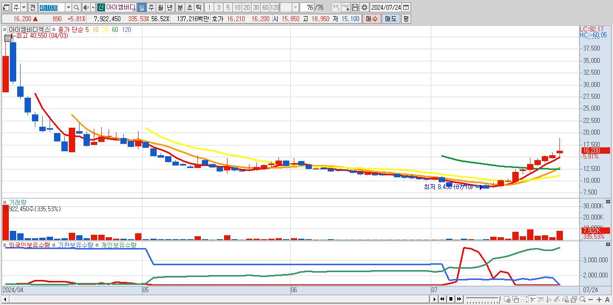 - 아이엠비디엑스 (16,200원 ▲ 5.81% , 시총: 2,271억, 거래량: 7,922,450, 거래대금:1,372억)