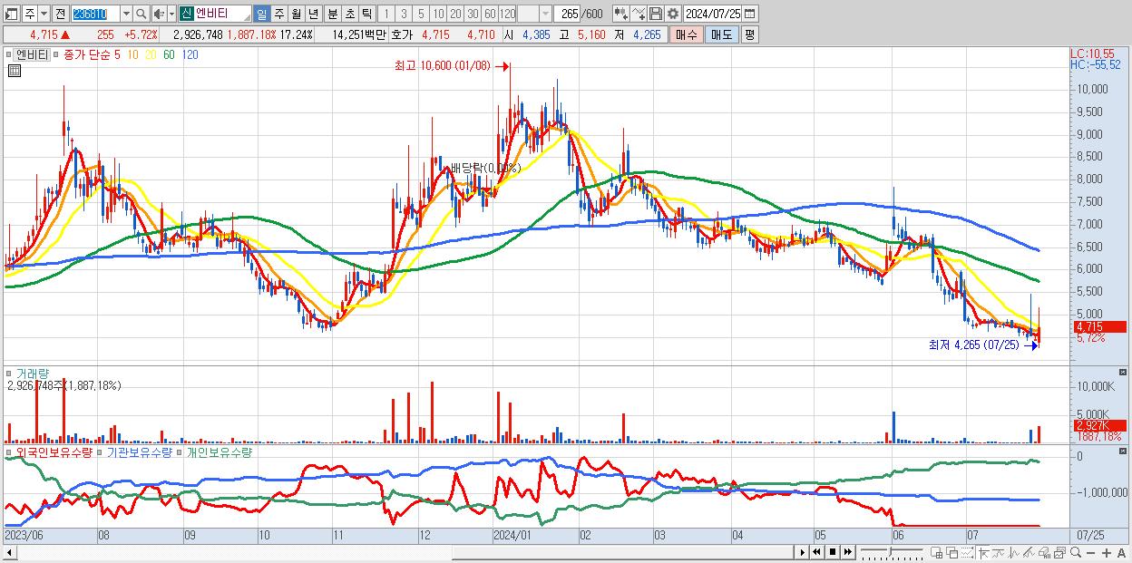- 엔비티 (4,715원 ▲ 5.72% , 시총: 800억, 거래량: 2,926,748, 거래대금:143억)
