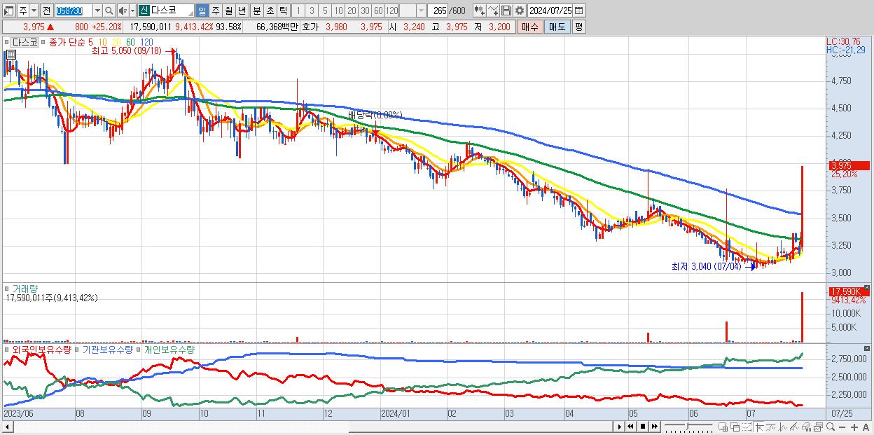 - 다스코 (3,975원 ▲ 25.2% , 시총: 747억, 거래량: 17,590,011, 거래대금:664억)