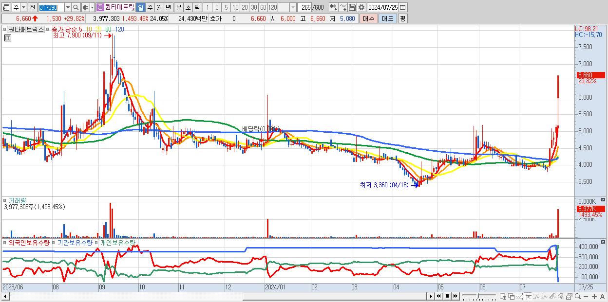 - 퀀타매트릭스 (6,660원 ▲ 29.82% , 시총: 1,101억, 거래량: 3,977,303, 거래대금:244억)