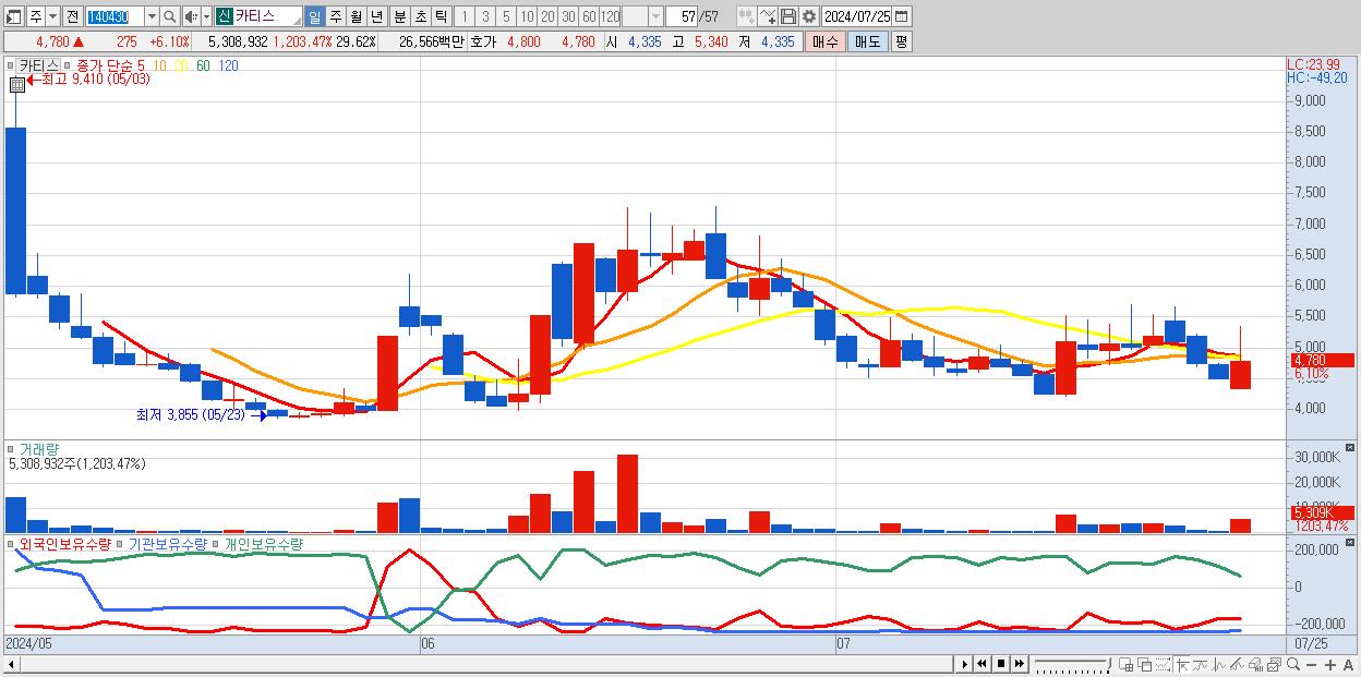 - 카티스 (4,780원 ▲ 6.1% , 시총: 857억, 거래량: 5,308,932, 거래대금:266억)