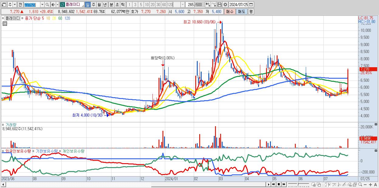 - 플레이디 (7,270원 ▲ 28.45% , 시총: 933억, 거래량: 8,948,602, 거래대금:621억)