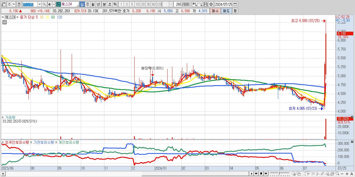 - 예스24 (6,190원 ▲ 16.14% , 시총: 1,548억, 거래량: 33,282,263, 거래대금:2,016억)