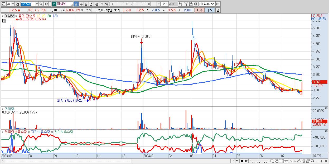 - 이엠넷 (3,265원 ▲ 12.78% , 시총: 727억, 거래량: 8,186,554, 거래대금:271억)
