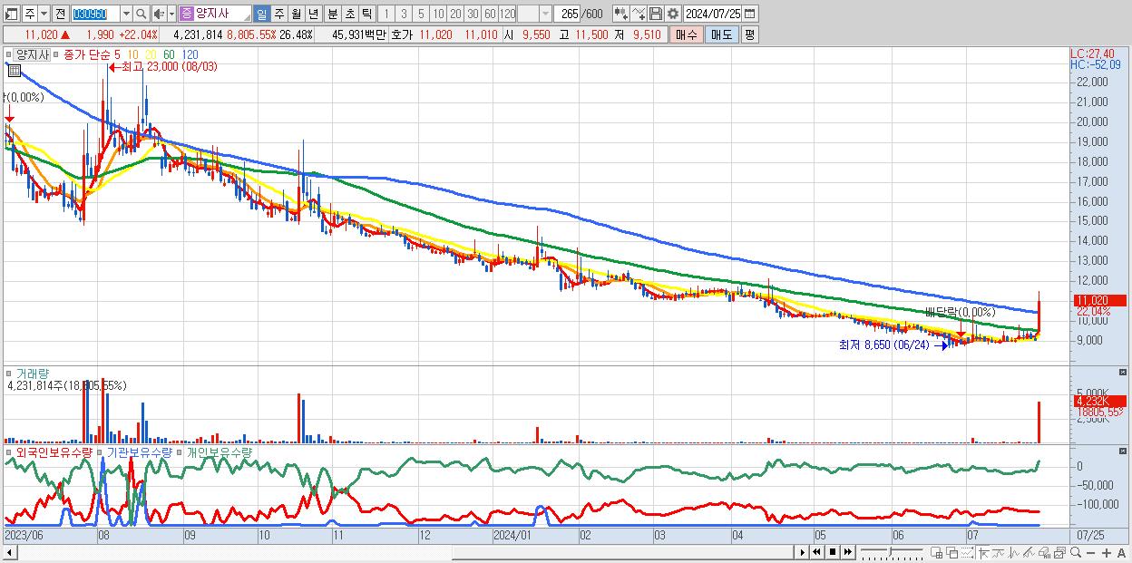 - 양지사 (11,020원 ▲ 22.04% , 시총: 1,761억, 거래량: 4,231,814, 거래대금:459억)