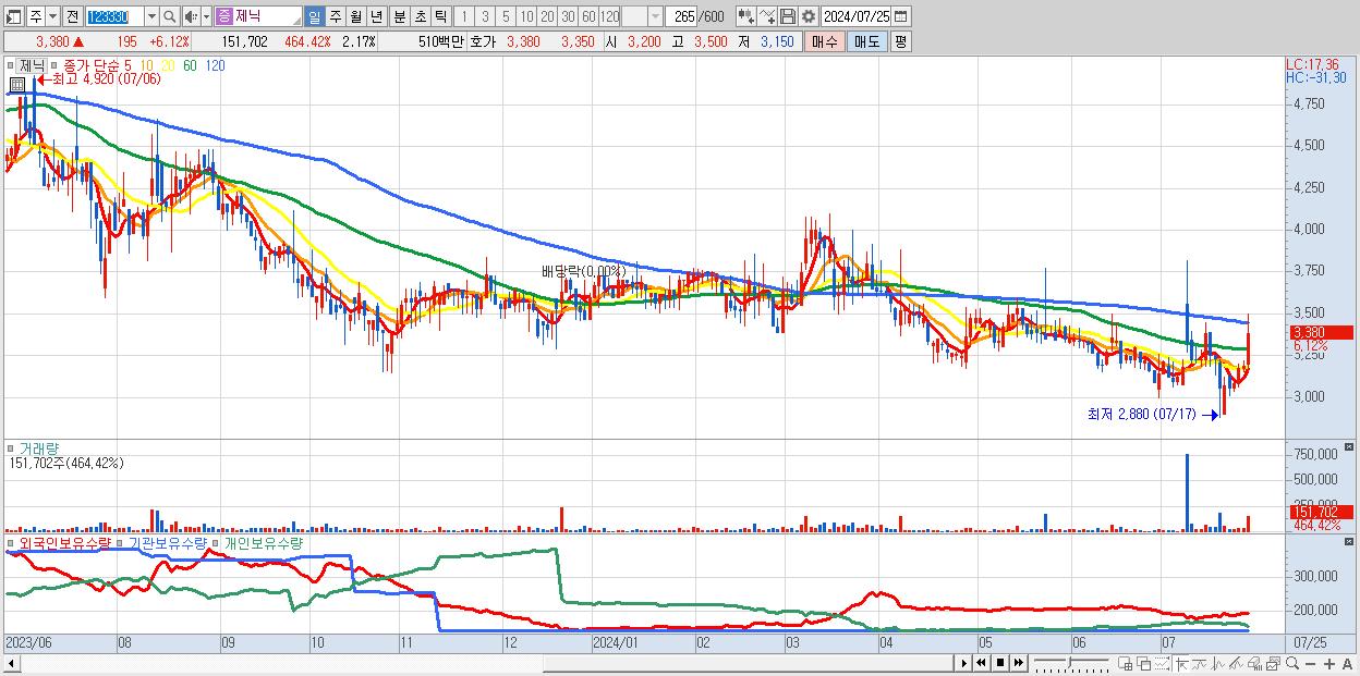 - 제닉 (3,380원 ▲ 6.12% , 시총: 237억, 거래량: 151,702, 거래대금:5억)