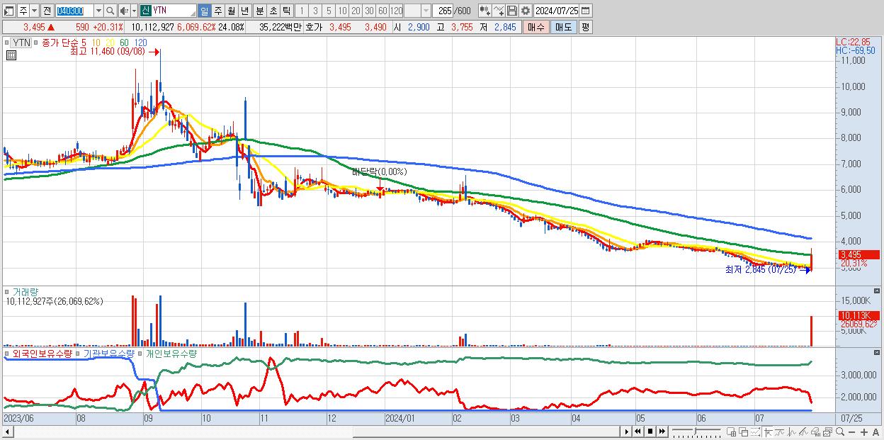 - YTN (3,495원 ▲ 20.31% , 시총: 1,468억, 거래량: 10,112,927, 거래대금:352억)