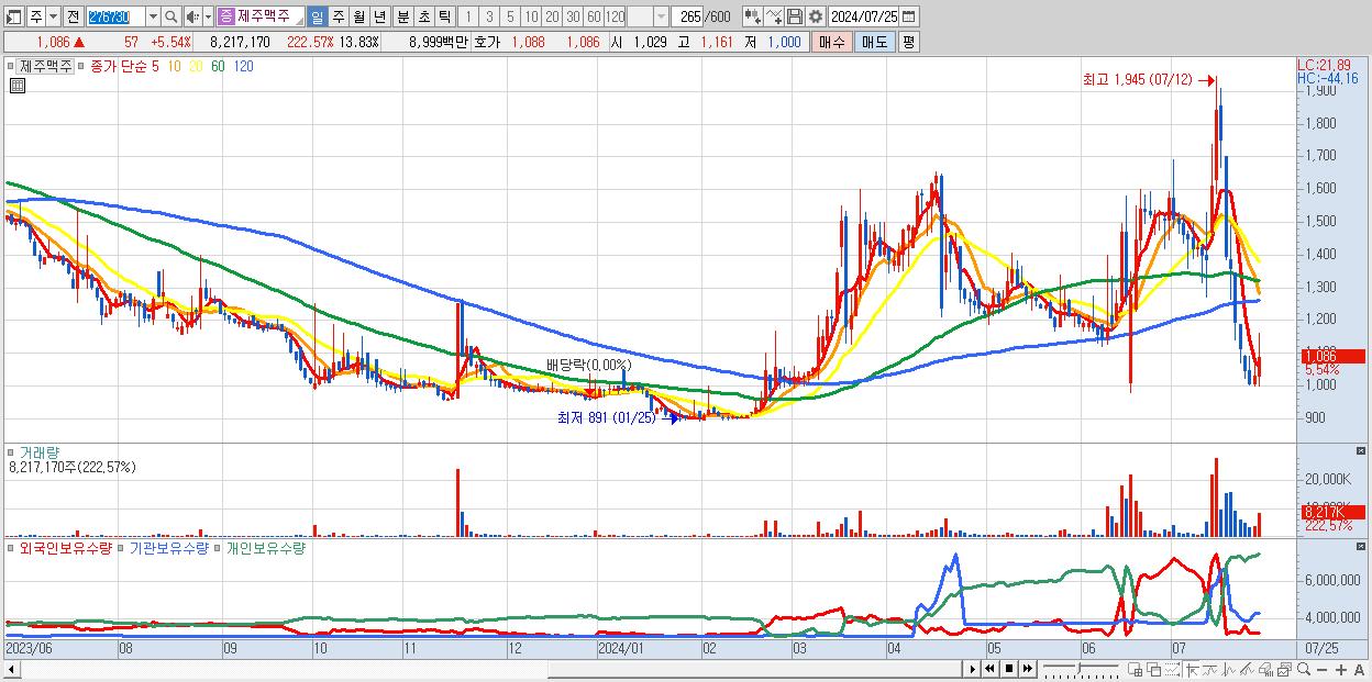 - 제주맥주 (1,086원 ▲ 5.54% , 시총: 645억, 거래량: 8,217,170, 거래대금:90억)
