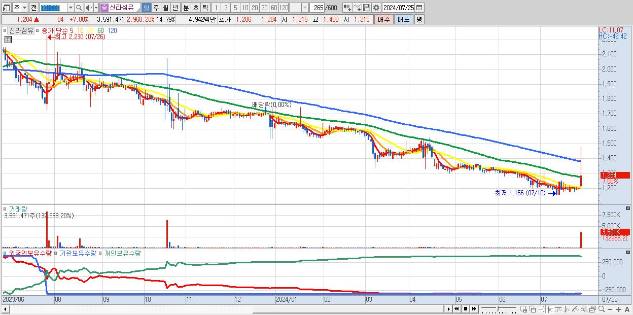 - 신라섬유 (1,284원 ▲ 7% , 시총: 312억, 거래량: 3,591,471, 거래대금:49억)