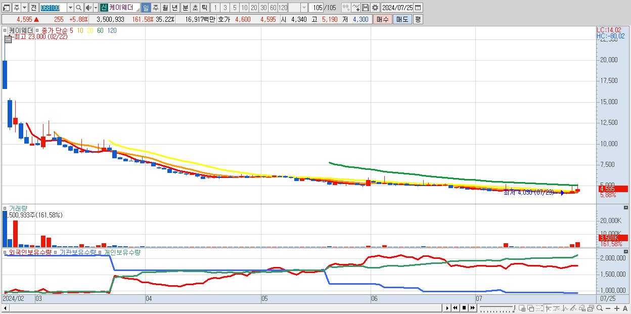 - 케이웨더 (4,595원 ▲ 5.88% , 시총: 457억, 거래량: 3,500,933, 거래대금:169억)