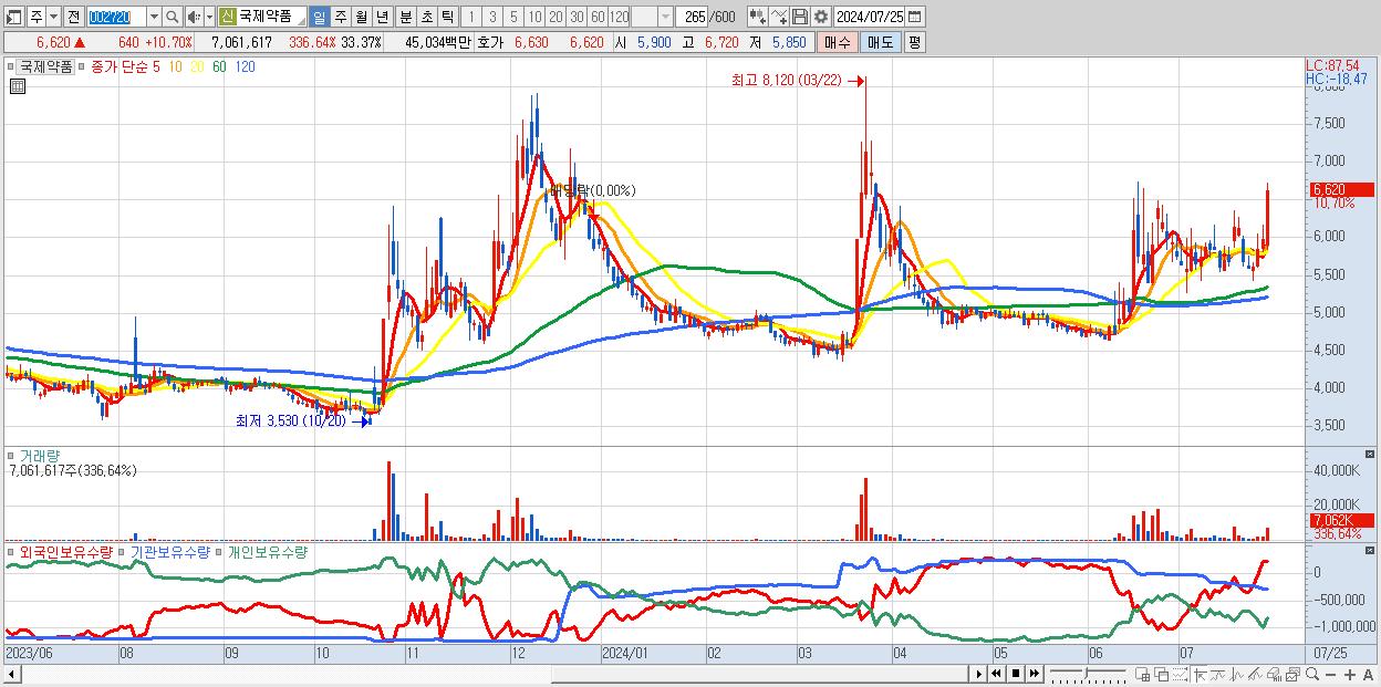 - 국제약품 (6,620원 ▲ 10.7% , 시총: 1,401억, 거래량: 7,061,617, 거래대금:450억)