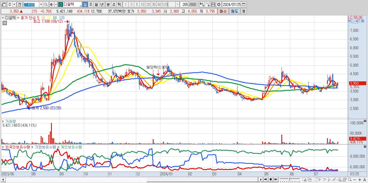 - 디알텍 (3,950원 ▲ 5.76% , 시총: 2,912억, 거래량: 9,421,148, 거래대금:371억)