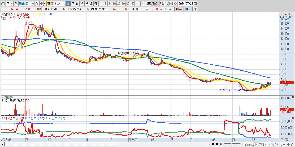 - 알체라 (3,440원 ▲ 8.18% , 시총: 757억, 거래량: 3,471,789, 거래대금:122억)