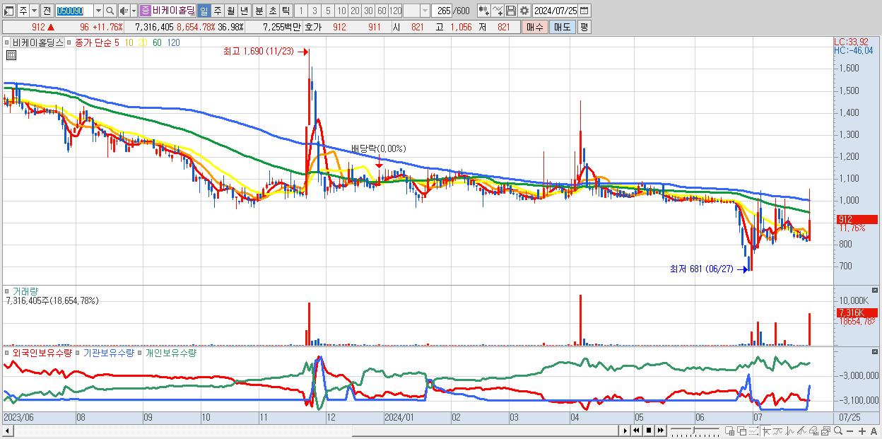 - 비케이홀딩스 (912원 ▲ 11.76% , 시총: 180억, 거래량: 7,316,405, 거래대금:73억)