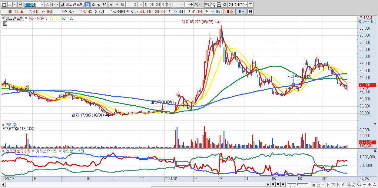 - 에코앤드림 (40,000원 ▲ 6.95% , 시총: 4,582억, 거래량: 397,672, 거래대금:156억)