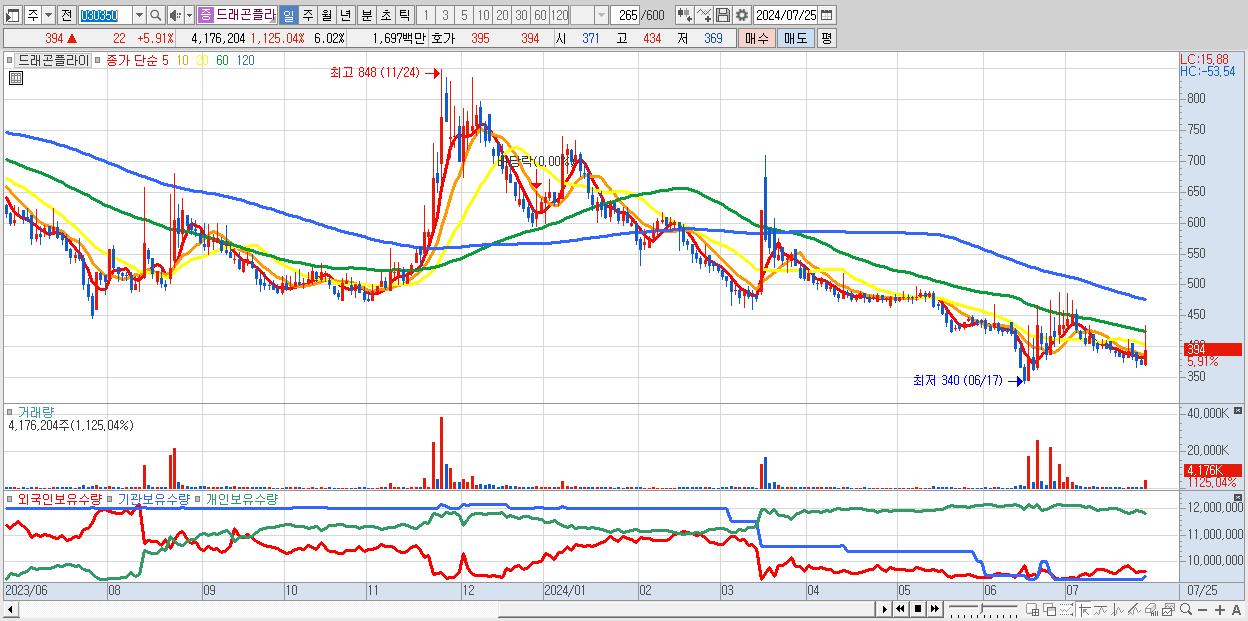 - 드래곤플라이 (394원 ▲ 5.91% , 시총: 273억, 거래량: 4,176,204, 거래대금:17억)