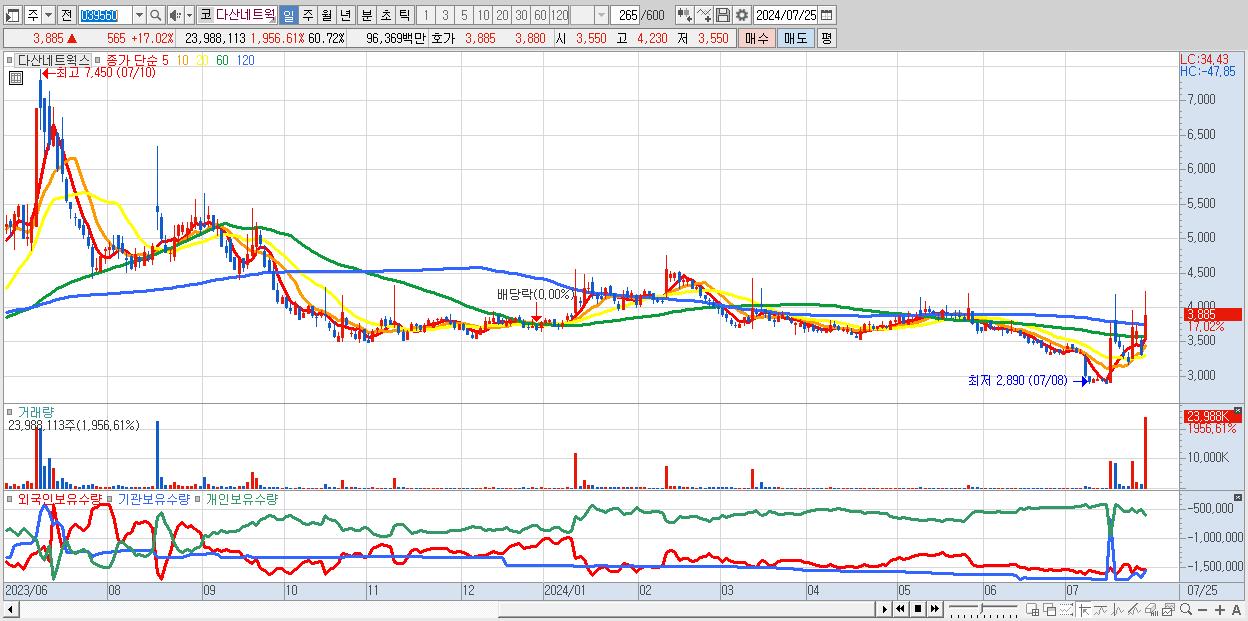 - 다산네트웍스 (3,885원 ▲ 17.02% , 시총: 1,535억, 거래량: 23,988,113, 거래대금:964억)