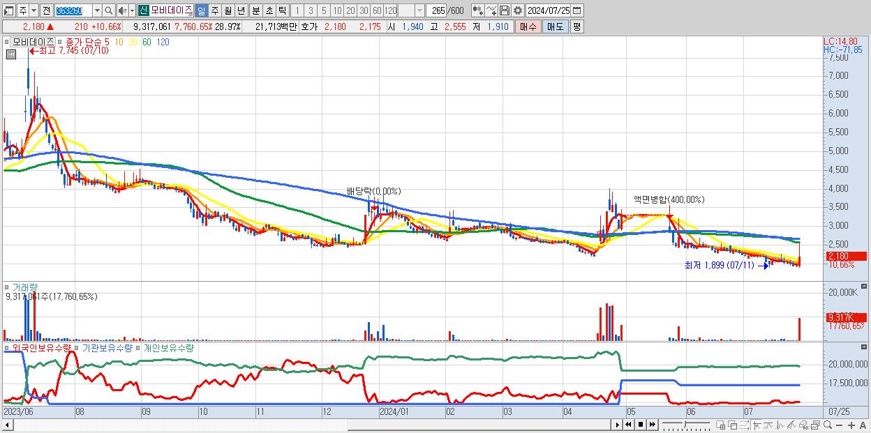 - 모비데이즈 (2,180원 ▲ 10.66% , 시총: 701억, 거래량: 9,317,061, 거래대금:217억)